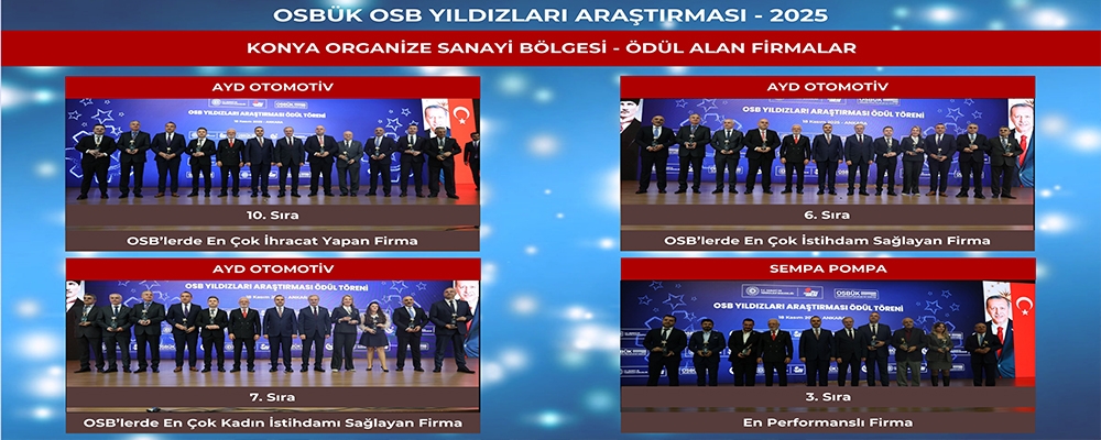 Organize Sanayi Bölgeleri Üst Kuruluşu (OSBÜK) tarafından bu yıl beşincisi düzenlenen OSBÜK OSB Yıldızları Araştırması’nda Konya Organize Sanayi Bölgesi’nde üretim yapan 2 firma 4 farklı kategoride yer alma başarısı gösterdi. AYD Otomotiv; OSB’lerde En Çok İhracat Yapan Firma Kategorisi’nde 10., OSB’lerde En Çok İstihdam Sağlayan Firma Kategorisi’nde 6., OSB’lerde En Çok Kadın İstihdamı Sağlayan Firma Kategorisi’nde 7. sırada yer aldı. Sempa Pompa ise En Performanslı Firma Kategorisinde 3. sırada yer alarak plaketini aldı. Konya Organize Sanayi Bölgesi de araştırmaya en çok katkı veren OSB’ler arasında plaketini aldı. Konya Organize Sanayi Bölgesi Başkanı Mustafa Büyükeğen, Konya Organize Sanayi Bölgesi’nden ödül alan firmaları başarılarından dolayı tebrik etti.