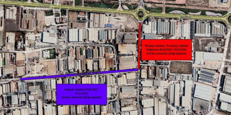 eisköy Caddesi - Evrenköy Caddesi Bağlantısı 26.02.2022 - 07.03.2022 tarihleri arasında trafiğe kapalı olacaktır. Yaylacık Caddesi ise 07.03.2022 - 04.04.2022 tarihleri arasında trafiğe kapatılacaktır. Çalışmanın olduğu caddelerde sadece sokakta bulunan firma çalışanlarının araçlarının girişine izin verilecektir. Trafik yoğunluğu yaşanmaması adına alternatif güzergahlar tercih edilmelidir. Anlayışınız için teşekkür ederiz.